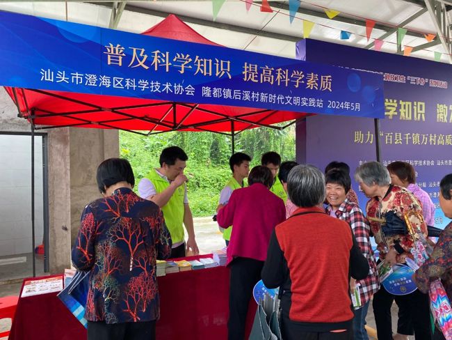 活动现场布设了科普宣传、反诈骗宣传、农科咨询及农技助农、卫生健康宣传及义医义诊、陶艺科普及展示、AI智能机器人展示、心肺复苏及防溺水安全知识宣传演示、电信科技宣传等摊位。区科协的志愿者向参加活动的村民面对面宣传我国科技创新取得的重大成就和科学思想、科学知识,并发放食品安全、卫生健康、减灾防灾、防范诈骗等科普宣传小册子近千份;同时举办食品安全科普知识进乡村图片展,进一步加强食品安全知识普及,提高村民对食品安全的认识。汕头市公安局澄海分局开展“你我同心 反诈同行”反诈骗宣传活动,向群众科普诈骗的类型手法、如何防范等知识,帮助村民提高防范意识、增强防范技能。汕头市白沙蔬菜原种研究所开展科普宣传暨农技进乡村助农活动,为农民群众提供蔬菜栽培、种植等方面的农科咨询,还根据村民的种植习惯和季节特点,现场为村民派送一批优良种子。广东省陶瓷研究所开展陶瓷科技文化宣传及展示活动,为小朋友们普及陶瓷基础知识、陶瓷科技文化,并带来生动有趣的现场陶艺制作体验。区人民医院、区护理学会组织由多名主任、副主任医师及主治医师组成的专家团队,免费为村民提供眼科、儿科、妇产科、内科、中医科、康复理疗科、护理等就诊、咨询服务,把优质的医疗技术和暖心的服务送到村民家门口,受到村民们的热烈欢迎。澄海职业技术学校开展AI智能机器人和科技创意手工艺制作展示活动,让村民了解人工智能科技在改变提升生活方面的应用以及对生活的重大影响。区蓝天救援队的专业队员为村民讲解心肺复苏和防溺水安全知识并现场操作演示,帮助村民提高应急救援能力。澄海电信科学技术协会开展电信科技宣传活动,向村民展示电信科技给生活带来便利和光彩。隆都镇委平安办、隆都镇后溪村委会还开展了平安法治和禁毒宣传活动。